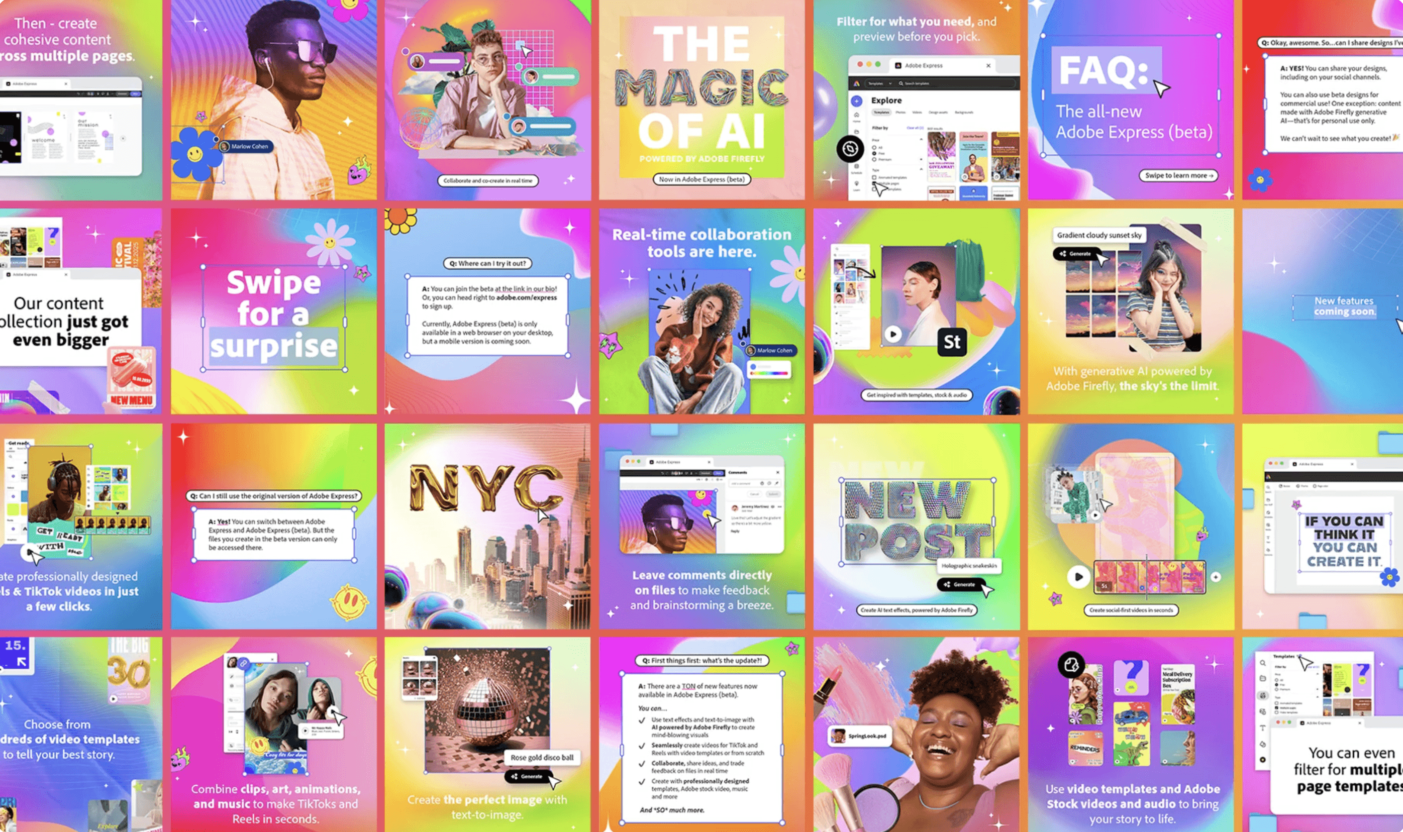Product launches have their own micro-brand to stand out in-feed against the regular content. Bright neon colors, emotive icons, and product UI elements to pull users directly into the digital creative experience Adobe Express is.